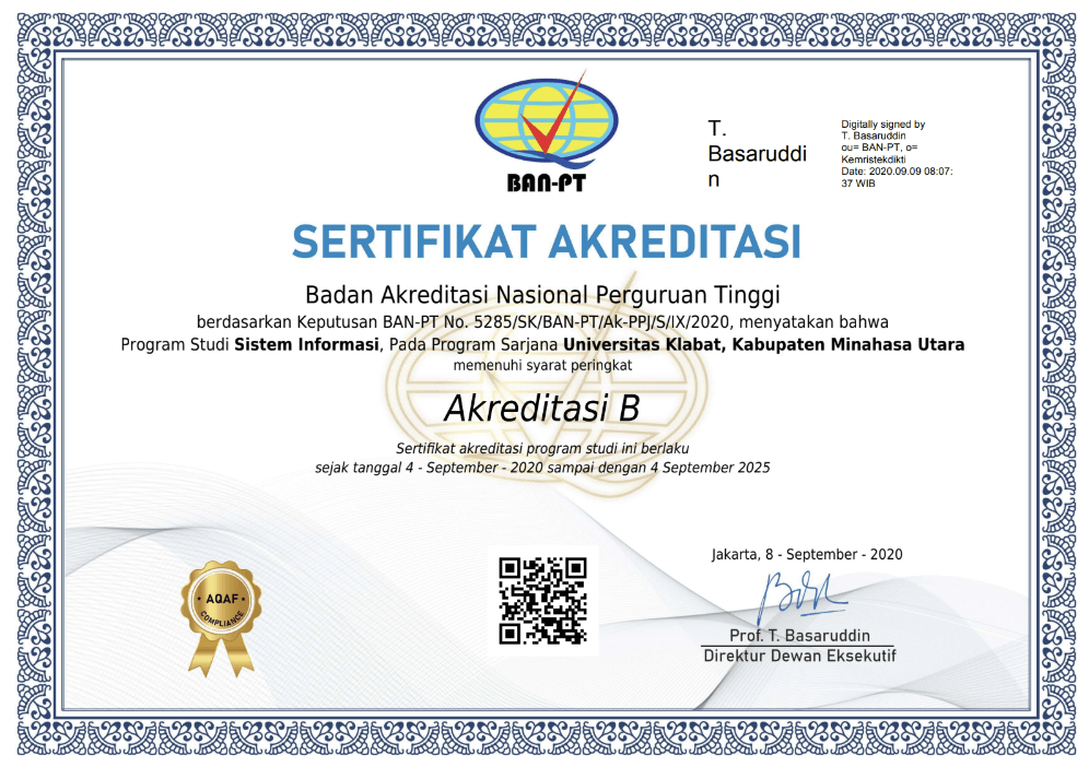 Program Studi Sistem Informasi telah ditetapkan peringkat akreditasi pada Program Sarjana Universitas Klabat, Kab. Minahasa Utara memenuhi peringkat Akreditasi Baik. berdasarkan Surat Keputusan BAN-PT Nomor : 5285/SK/BAN-PT/Ak-PPJ/S/IX/2020. Peningkatan akreditasi ini menunjukkan komitmen FILKOM dalam memberikan pendidikan berkualitas yang sesuai dengan standar nasional.